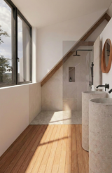 Pour adoucir les géométries, nous avons introduit des éléments plus sensibles, comme des parois courbes ou des plafonds aux lignes continues. Ces choix apportent une atmosphère plus fluide et plus enveloppante. Les matériaux, volontairement sobres et durables — bois, matières minérales, enduits clairs — participent à créer des ambiances calmes, chaleureuses et intemporelles.